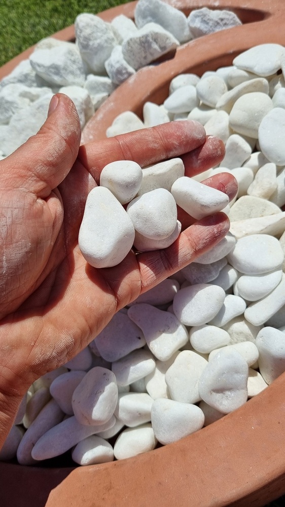 Описание: Щебень мраморный белый галтованный (Скруглённые камешки). Подойдёт для ландшафтного дизайна, отсыпки придомовых территории, производства бетонных изделий под шлифовку. Для отсыпки 1кв.м при толщине слоя 40-50мм нужно 50-60кг щебня